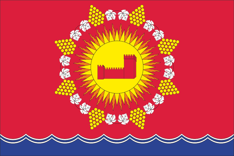 отношением ширины флага к его длине 2:3; в нижней части полотнища – волнисто выщербленная горизонтальная полоса синего цвета, к которой сверху примыкают тонкие волнисто-выщербленные полосы белого, синего, белого цветов (максимальная высота синей полосы с тонкими полосами 1/7 ширины полотнища; ширина каждой из тонких полос – 1/49 ширины полотнища); в центре полотнища – солнце (без изображения лица) жёлтого цвета с чередующимися прямыми и пламенеющими лучами, окружённое кольцом из виноградных гроздей жёлтого цвета и виноградных листьев белого цвета: гроздья направлены от солнца к краям полотнища, листья, расположенные попарно между каждой парой гроздей, направлены к солнцу, сложены попарно веерообразно и в каждой паре переплетены стеблями (диаметр солнца по крайним точкам лучей – 3/8 ширины полотнища; внешний диаметр кольца по крайним точкам – 9/10 ширины полотнища; длина крепостной стены 7/20 ширины полотнища).