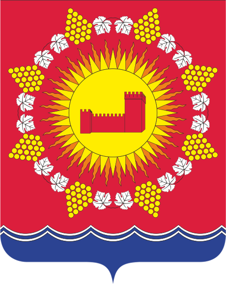 «В червлёном поле с узкой, волнисто выщербленной и дважды нитевидно окаймленной серебром, лазоревой оконечностью золотое солнце (без изображения лица), окруженное сложенными в кольцо чередующимися золотыми гроздьями винограда и серебряными виноградными листьями (по два листа между каждой парой гроздей, причём грозди положены от солнца и сообразно его лучам, а листья направлены к солнцу, в парах сложены веерообразно и попарно переплетены черенками), обременённое червлёной крепостной стеной с низким бастионом справа и высоким слева».