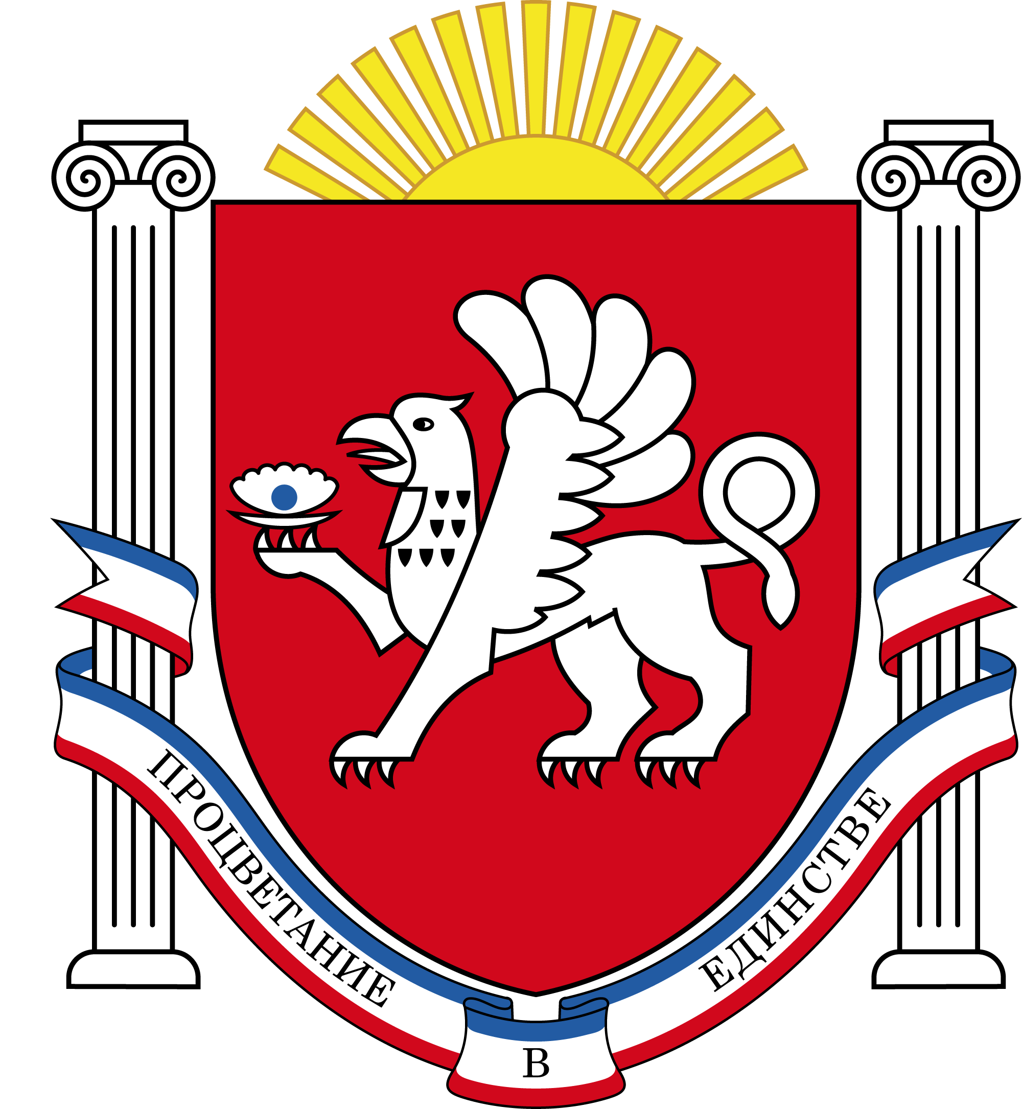 Щит увенчан восходящим солнцем и окружён двумя белыми колоннами, соединёнными сине-бело-красной лентой с девизом: «Процветание в единстве».